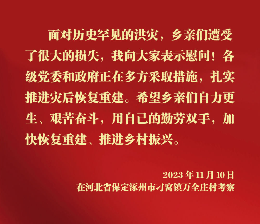 刁窝镇万全庄村位于兰沟洼蓄滞洪区,今年汛期全村311户全部受灾。习近平仔细察看村道、房屋等恢复重建情况。他走进房屋重建施工现场,询问受灾损失、施工进展、租房过渡等情况。临别时,村民们高声向总书记问好。