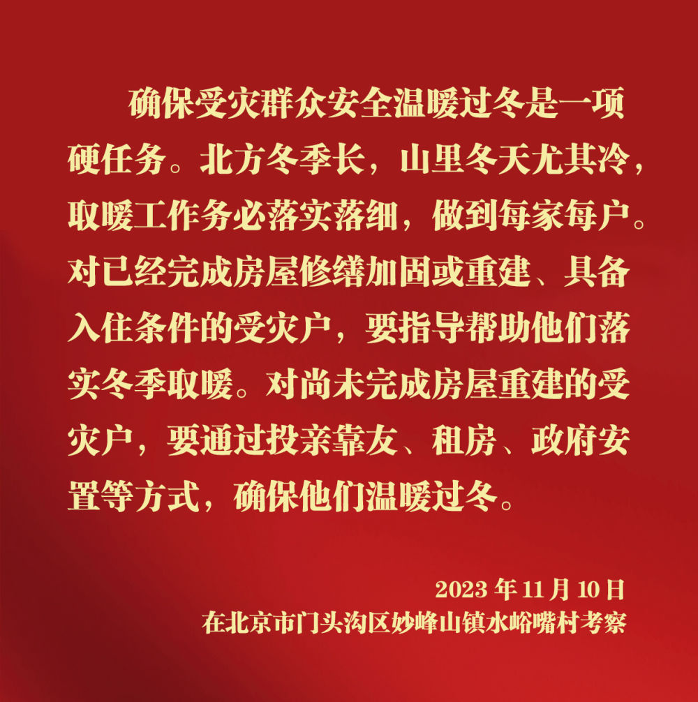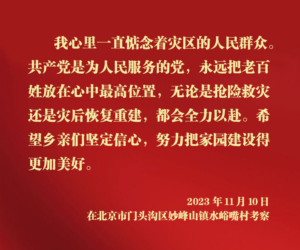 11月10日,中共中央总书记、国家主席、中央军委主席习近平在北京、河北考察灾后恢复重建工作。他先后来到门头沟、保定等地,实地了解灾后恢复重建情况。 在妙峰山镇水峪嘴村,习近平听取该村情况介绍,随后步行察看村容村貌,了解基础设施恢复建设提升等情况。在村民李盟家,习近平详细询问房屋受损、修缮支出、取暖等情况。