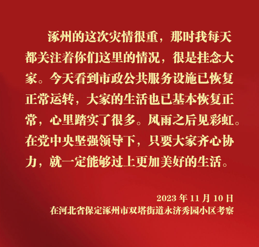 10日下午,习近平来到保定涿州市双塔街道永济秀园小区。他走进居民董彩英家看望慰问,详细询问洪水水位、应急居住、家具家电更新、供暖、相关补助等情况。