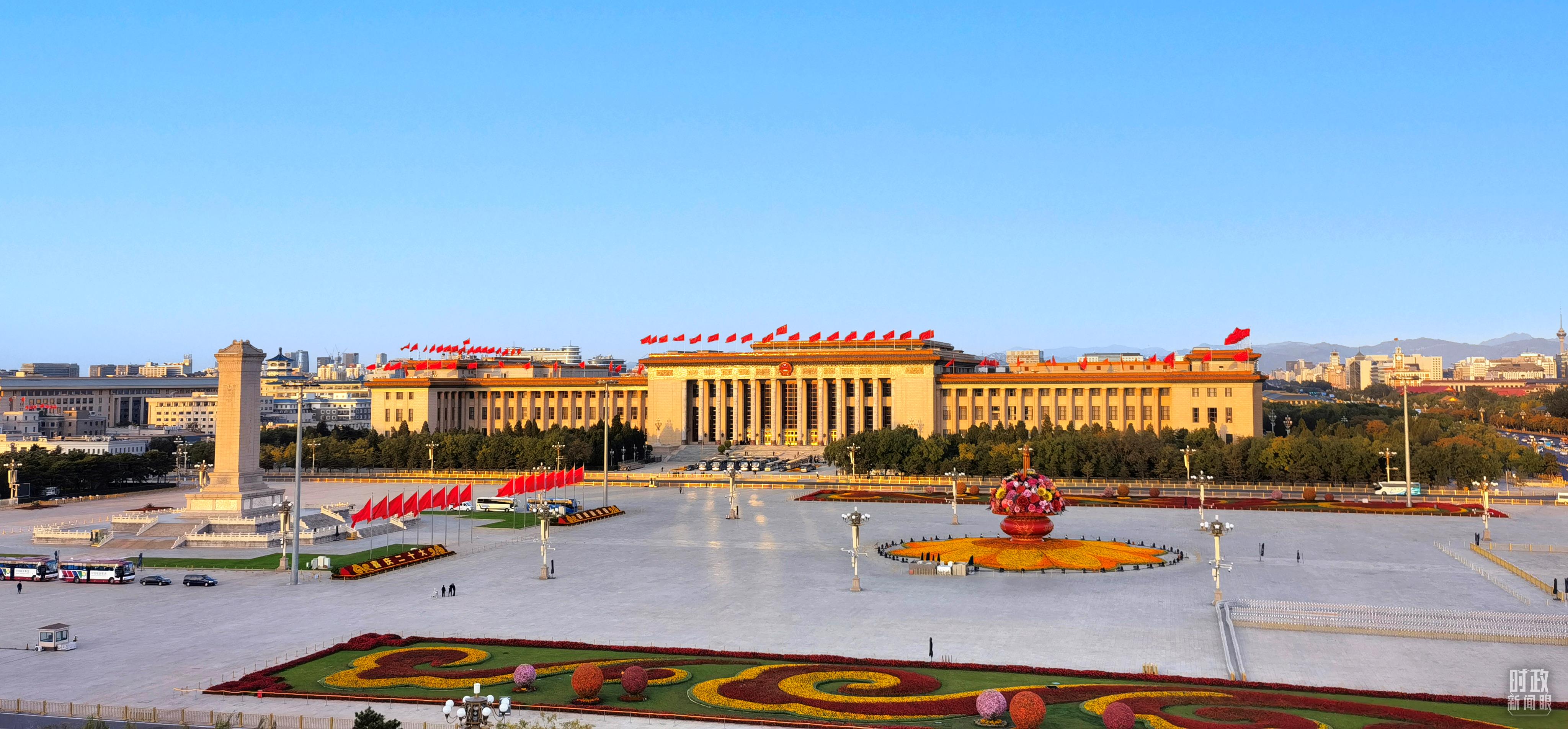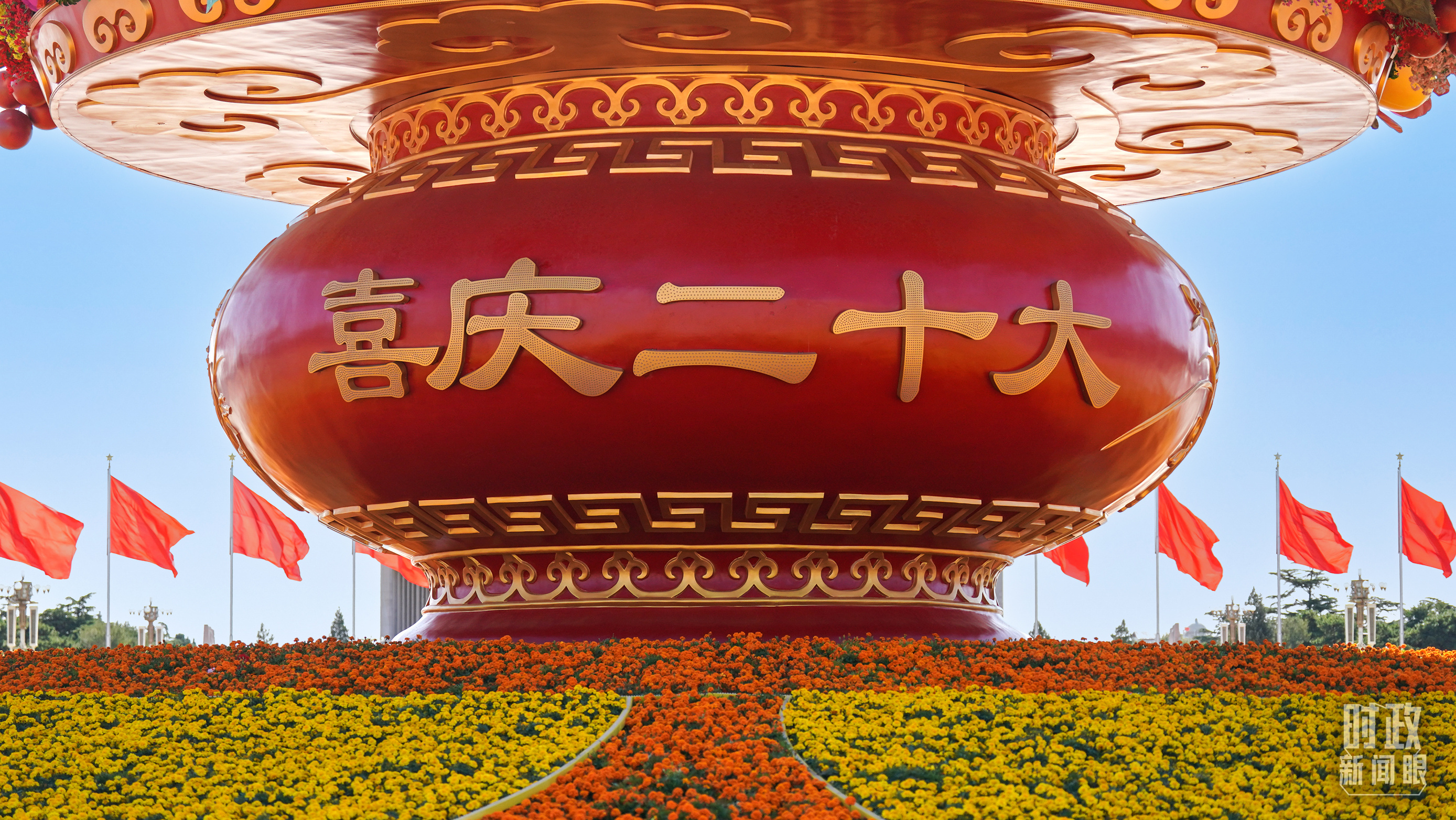 △16日清晨的天安门广场。(总台央视记者范学禹拍摄) 迎着现场2300多名代表和特邀代表的殷切目光,总书记作了题为《高举中国特色社会主义伟大旗帜 为全面建设社会主义现代化国家而团结奋斗》的报告。