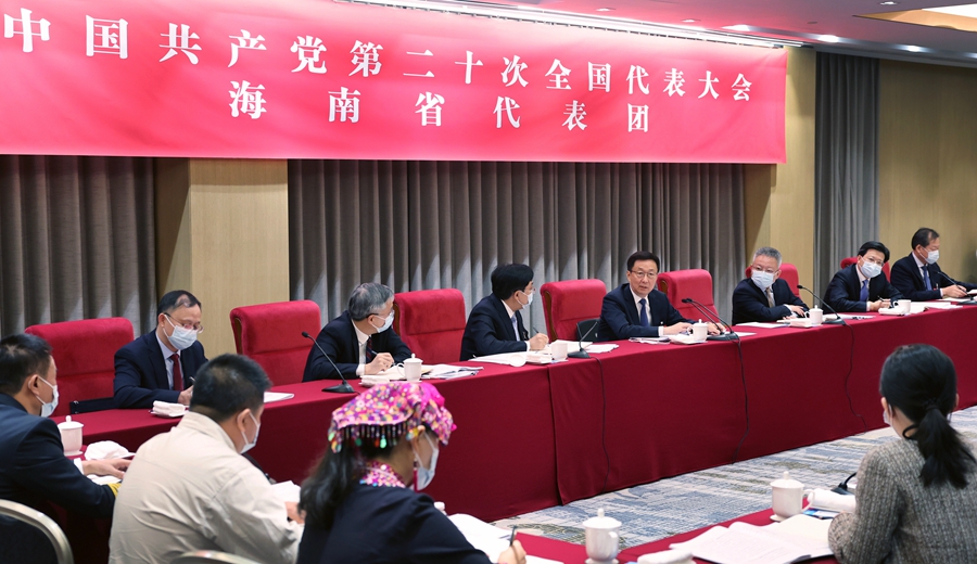 10月17日,韩正同志参加他所在的党的二十大海南代表团讨论。新华社记者 姚大伟 摄 新华社北京10月17日电 韩正同志17日上午来到他所在的党的二十大海南省代表团,与代表们一起讨论党的二十大报告。他表示,完全赞成和拥护习近平总书记代表十九届中央委员会向大会所作的报告。 韩正指出,习近平总书记所作的报告,凝聚了全党全国智慧,反映了人民意愿。报告准确把握新时代党和国家事业发展的历史进程,实事求是总结过去5年的工作和新时代10年的伟大变革,深入研判新时代新征程我国发展面临的国际国内环境,全面阐述了未来一个时期党和国家工作的大政方针和战略部署。报告高屋建瓴、开拓创新、求真务实,具有很强的思想性、战略性、前瞻性、指导性,是党团结带领全国各族人民高举中国特色社会主义伟大旗帜、谱写新时代中国特色社会主义新篇章的纲领性文献。 韩正表示,党的十八大以来,在以习近平同志为核心的党中央坚强领导下,在习近平新时代中国特色社会主义思想指引下,全党全国各族人民团结奋斗,党和国家事业取得历史性成就、发生历史性变革,中华民族迎来从站起来、富起来到强起来的伟大飞跃。党确立习近平同志党中央的核心、全党的核心地位,确立习近平新时代中国特色社会主义思想的指导地位,对新时代党和国家事业发展、对推进中华民族伟大复兴历史进程具有决定性意义。我们要深刻领悟“两个确立”的决定性意义,增强“四个意识”、坚定“四个自信”、做到“两个维护”。充分认识新时代10年伟大变革的里程碑意义,按照党的二十大报告部署,坚定不移推进中华民族伟大复兴历史进程。 韩正强调,要坚持发展是第一要务,贯彻新发展理念,坚定不移推动高质量发展。要坚持以人民为中心的发展思想,扎实推进全体人民共同富裕,保障和改善民生,让发展成果更多更公平惠及全体人民。要坚持统筹发展和安全,确保粮食安全、能源安全和产业链供应链稳定。 海南省代表团的代表踊跃发言,会场气氛热烈。在认真听取代表们发言后,韩正指出,海南要深入贯彻落实党的二十大精神,进一步高标准推进海南自由贸易港建设。要聚焦贸易和投资自由化便利化,坚持蹄疾步稳,紧盯发展目标,加强制度集成创新,夯实产业基础,加快完善基础设施,强化风险防控,推动海南全面深化改革开放不断取得新进展。