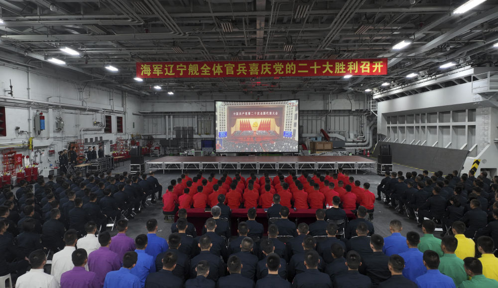 10月16日,辽宁舰全体官兵收看中国共产党第二十次全国代表大会开幕会。新华社发(任泽霖 摄) 直播结束后,官兵随即展开讨论交流。机电部门一级军士长崔荣德与大家分享心得:“报告提出,打造强大战略威慑力量体系,增加新域新质作战力量比重。十年间,辽宁舰实现了从试验训练平台到备战打仗先锋的华丽转身,探索出一条具有中国特色的航母发展之路。我们要把学习报告激发的政治热情转化为练兵动力,继续在任务中扎根战位、磨砺本领。”