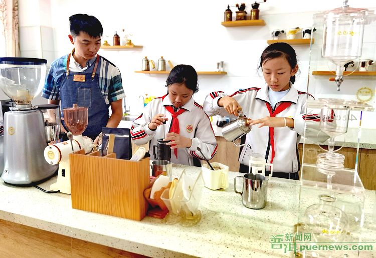△思茅四小的学生正在学习咖啡冲泡。(思茅区融媒体中心提供)