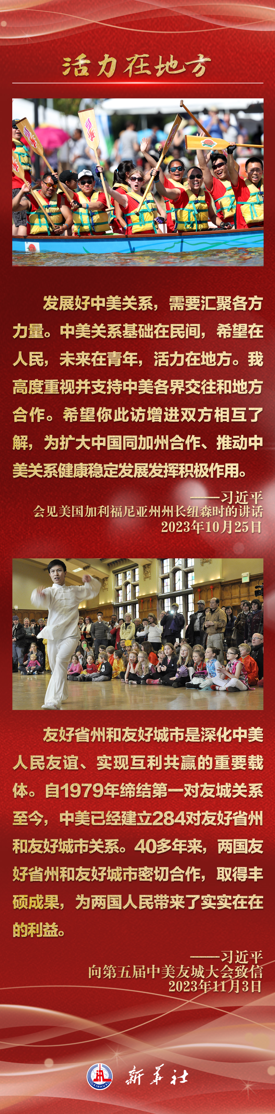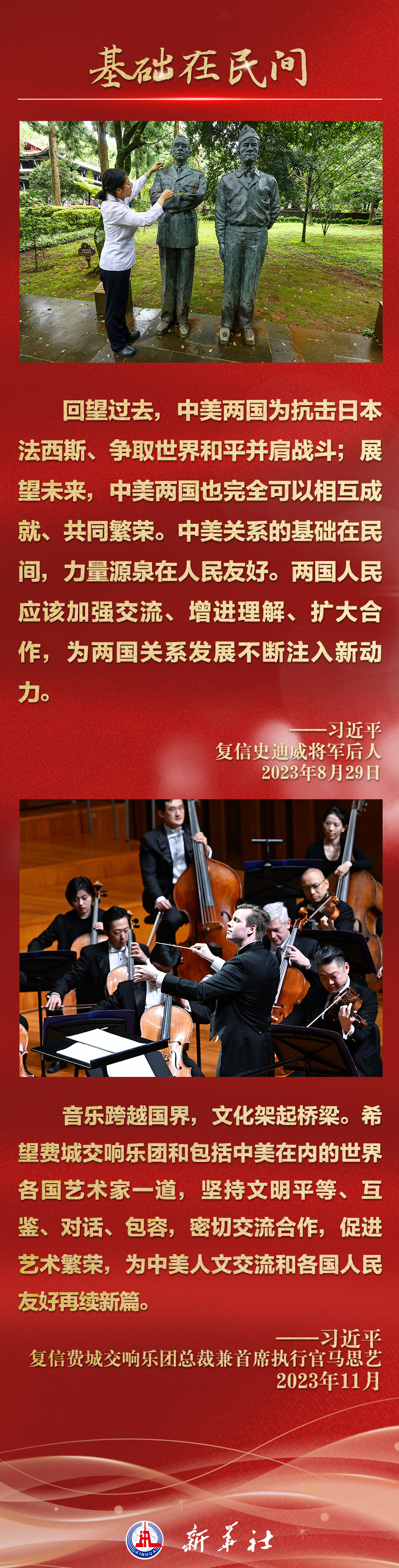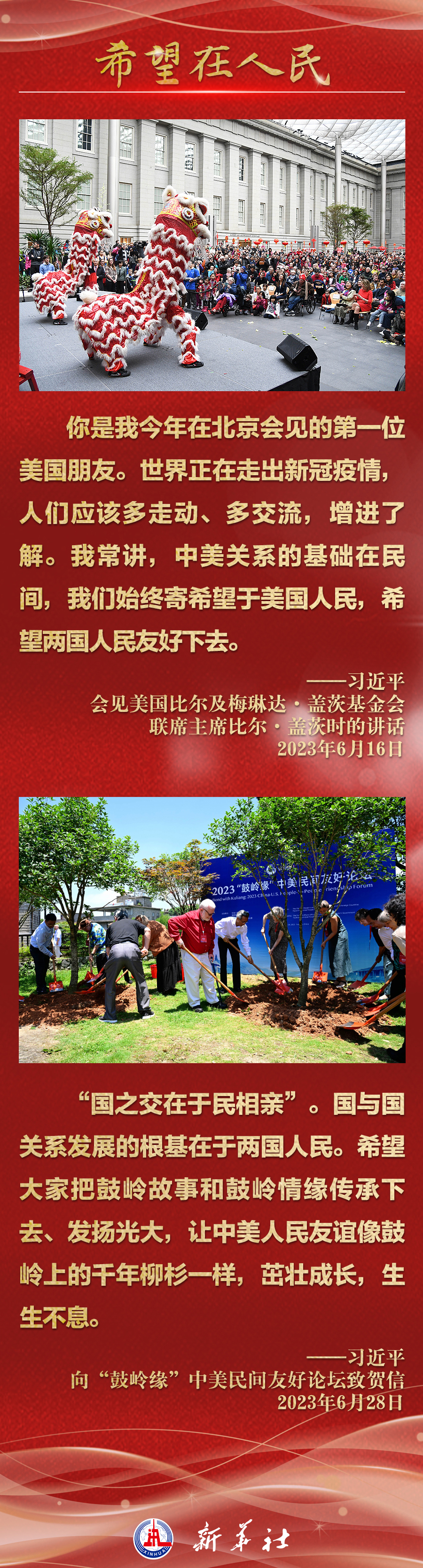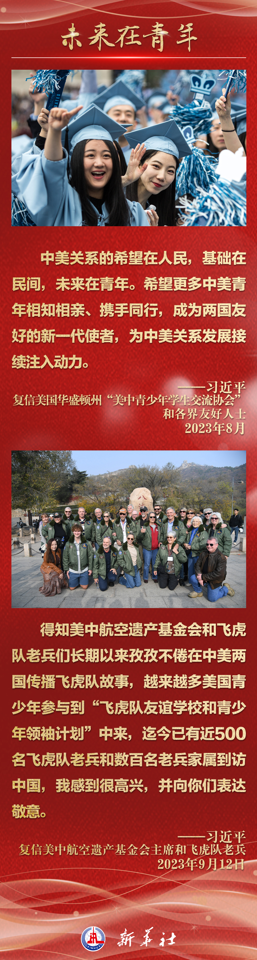 今年以来,从在京会见美国各界人士,到向“鼓岭缘”中美民间友好论坛等活动致贺信,再到复信美国华盛顿州“美中青少年学生交流协会”、史迪威将军后人、飞虎队老兵等友好人士,习近平主席同美国各界真挚互动,强调中美关系基础在民间,希望在人民,未来在青年,活力在地方。