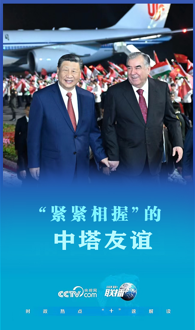 联播+盛夏时节,地处吉萨尔盆地的塔吉克斯坦首都杜尚别在巍峨雪山映衬下,宁静壮美。 当地时间7月4日晚,习近平主席乘专机抵达杜尚别,开启他对塔吉克斯坦的第三次国事访问。 在拉赫蒙总统为习近平主席举行的盛大迎宾仪式上,一张照片记录下习主席与拉赫蒙总统手拉手并肩前行的一幕。 10年前,习近平主席首访“高山之国”塔吉克斯坦时,两国元首就是手拉手并肩而行,已成就了一段外交佳话。 “好兄弟就要手拉手前进!”那次访问期间,拉赫蒙总统陪同习主席近10个小时。其间,他多次主动握住习主席的手,表示“这次访问的一个重要成果,就是我同你成为更加亲密的兄弟”。 此后10年间,两国元首一次次“携手并肩”,引领中塔关系进入快速发展期。 携手并肩蕴含中塔“以心相交”的深厚情谊。 中塔山水相连,两国人民有着2000多年的友好交往史。张骞、玄奘等在中亚都曾留下友好足迹,索莫尼、鲁达基等塔吉克斯坦历史文化名人故事也在中国广为流传。 2019年访问塔吉克斯坦时,习主席在发表于当地媒体的署名文章中有这样一个的细节——“粟特人多姿的身影成为唐三彩骆驼载乐俑的主角”。这一细节反映出中塔文化交流的多姿多彩,也是中塔世代友好的生动注脚。 近年来,习近平主席同拉赫蒙总统通过会见、通话等多种形式保持高频互动,结下深厚友谊,每次见面都如老友重逢,留下不少温暖瞬间。