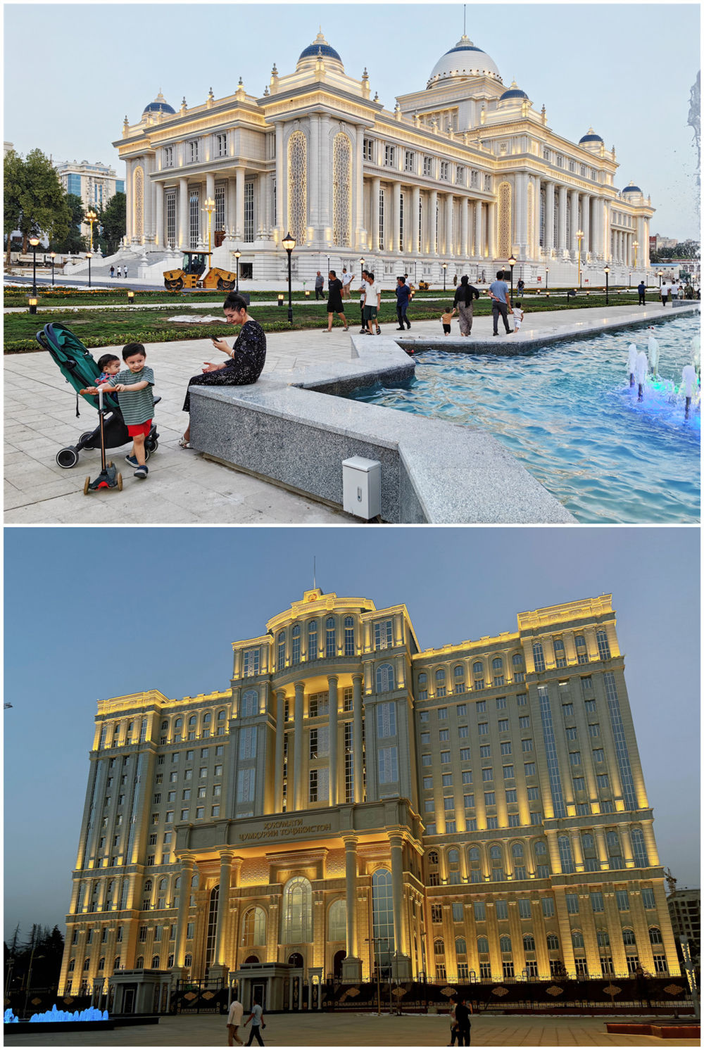 6月29日,在塔吉克斯坦首都杜尚别,人们在议会大楼和政府大楼前散步。(拼版照片)。 “这里很美很现代。”在议会大楼外的广场上,20岁的舒克罗娜欢快的舞姿引起路人和记者的注意:“我想用跳舞来表达快乐。我的国家正在发展,光是首都这几年就有了很多漂亮的高楼。” 与5年前记者在这里采访时相比,高楼多了,当地民众能去的商场、店铺和咖啡厅多了;夜晚亮了,常见带着孩子的一家人在张灯结彩的公园里消暑纳凉;街道宽了,平整的马路和新建的立交桥上车来车往。