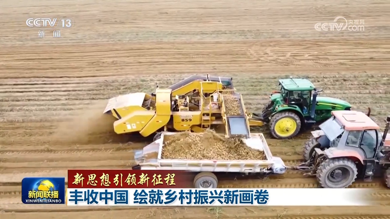 金秋时节,广袤田野上稻浪滚滚、五谷丰登。在东北平原,黑龙江北大荒集团鹤山农场的33万亩大豆迎来收获,53台大马力收割机,正抓住晴好天气昼夜抢收。在黄淮海地区,玉米收获陆续开启。在西南地区,水稻收获进入尾声。内蒙古鄂尔多斯的马铃薯收获进入高峰,新投入的联合收获机让马铃薯实现了全程机械化采收。这一幅幅绚烂的丰收画卷凝聚着亿万农民的耕耘与奋斗。 习近平总书记高度重视“三农”工作,推动设立“中国农民丰收节”,这是第一个在国家层面为农民设立的节日。在第七个中国农民丰收节到来之际,习近平总书记向全国广大农民和工作在“三农”战线上的同志们致以节日祝贺。他强调,要千方百计推动农业增效益、农民增收入、农村增活力,让农民群众可感可及、得到实惠。 粮食安全是“国之大者”。习近平总书记指出,今年,我们克服较为严重的自然灾害等不利影响,实现夏粮增产、早稻稳产,全年粮食有望再获丰收,为巩固和增强经济回升向好态势、推动高质量发展提供了有力支撑。