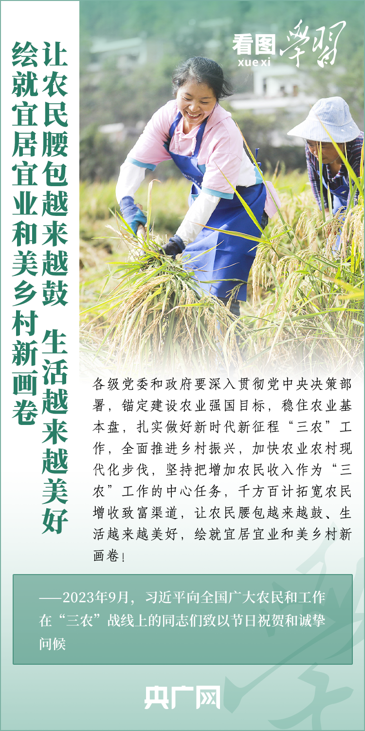 民族要复兴,乡村必振兴。党的十八大以来,每到各地考察调研,习近平总书记总会去农村看一看,走进田间地头,和农民拉拉家常。总书记强调,“建设宜居宜业和美乡村是农业强国的应有之义”,“要让农民腰包越来越鼓、生活越来越美好”。
