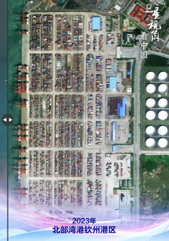 左右滑动看变化 2007年,广西防城港、钦州港、北海港“三港合一”,北部湾港应运而生,成为我国面向东盟开放发展的前沿。钦州港是北部湾港口抱团发展、强势崛起的缩影,目前已建成全国首个海铁联运自动化集装箱码头,各式各样运往东盟各国的货物在这里实现“下船即上车,下车即上船”。 2023年,北部湾港年集装箱吞吐量首破800万标箱,增幅连续七年保持两位数增长,增速位列全国沿海主要港口前列。