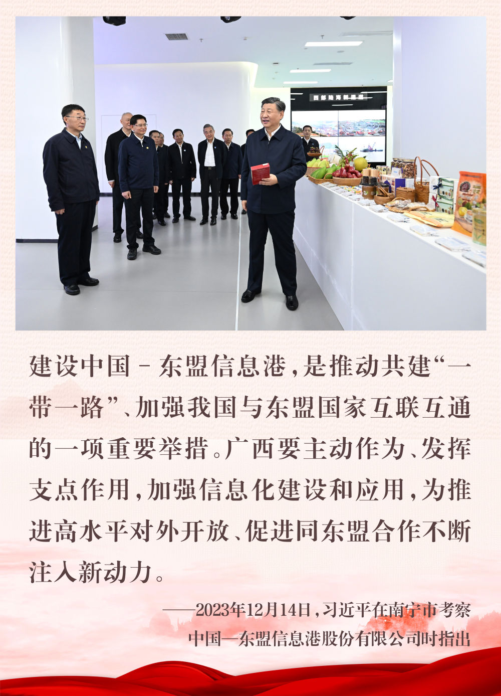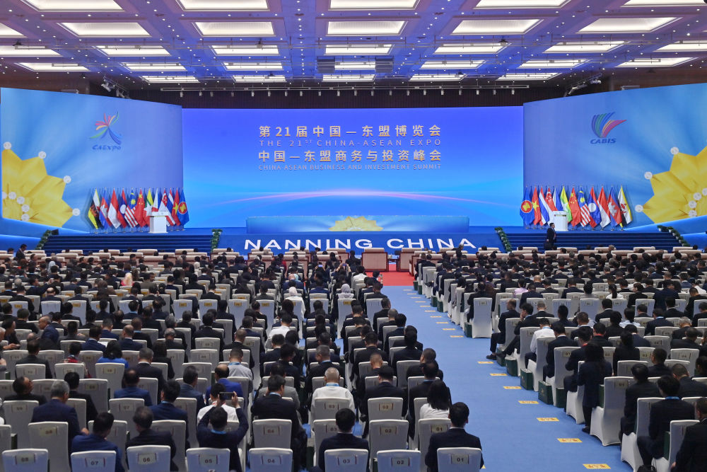 9月24日,第二十一届中国—东盟博览会和中国—东盟商务与投资峰会在广西南宁开幕。  在中国—东盟合作框架中,中国—东盟博览会和中国—东盟商务与投资峰会发挥着重要的开放平台作用。 2024年9月24日拍摄的南宁国际会展中心。2020年和2021年,习近平主席先后为中国—东盟博览会和中国—东盟商务与投资峰会致辞、致贺信,充分体现对这一合作平台的关心和重视。   习近平主席高度重视中国—东盟合作,曾在多个场合作出重要指示,为中国—东盟合作指明方向。   积极服务建设中国—东盟命运共同体,是以习近平同志为核心的党中央赋予广西的重要使命。多年来,广西发挥与东盟陆海相连的区位优势,把握区域全面经济伙伴关系协定(RCEP)机遇,积极促进与东盟国家的经贸合作。2024年上半年,广西对东盟进出口1856.2亿元,创历史同期新高,同比增长26.7%,东盟连续24年成为广西第一大贸易伙伴。 2023年12月12日拍摄的中国-东盟信息港股份有限公司内景。历经多年建设,中国-东盟信息港正努力打造面向东盟的国际通信大通道、大数据资源应用服务大枢纽、新一代信息技术应用示范高地、数字经济开放合作集聚区和人文交流合作中心。 中国-东盟信息港股份有限公司员工在工作中(2024年8月22日摄)。 这是在广西南宁拍摄的东盟商务区外景(2023年9月7日摄,无人机照片)。 西部陆海新通道铁海联运班列从钦州港东站驶出(2024年5月12日摄,无人机照片)。随着中国-东盟开放平台建设向纵深推进,西部陆海新通道正在成为释放开放活力的强力新引擎,以物流为切入口,促进资金、资源、人员、技术等生产要素深度融合。 2024年3月8日,在南宁国际铁路港,一列中越班列准备发往越南河内。西部陆海新通道铁海联运班列和中欧班列、中越班列、中老铁路等相互衔接联通,搭建起“多向延伸、海陆互联”的运输服务网络,中国西部地区面向东盟的国际大通道日趋通达。 夜幕下的广西钦州港码头(2024年5月9日摄,无人机照片)。钦州港作为我国西南陆路运输距离最短的出海口,北接丝绸之路经济带,南连21世纪海上丝绸之路,是我国西南地区走向东盟国家最便捷的出海大通道。 铁海联运班列在钦州集装箱中心站整装待发(2023年11月24日摄,无人机照片)。近年来,广西以高水平建设西部陆海新通道为牵引,建设面向东盟的国际大通道、大平台,加快打造向海经济,推动构建陆海相通、多区联动的开放格局。 钦州港集装箱装卸自动化码头的集装箱储放地(2024年5月19日摄,无人机照片)。 施工队在广西钦州市拆旧桥建新桥,疏浚平陆运河流经钦州市区的航道(2024年5月12日摄,无人机照片)。平陆运河建成后将成为广西及西南地区通往东盟地区运距最短、最便捷的水运出海通道。 这是在广西南宁泰克半导体有限公司拍摄的内存条产品(2024年5月27日摄)。广西围绕新能源汽车、电子信息、新材料等产业集群,积极构建“粤港澳大湾区研发+广西制造+东盟市场”产业协作体系,取得明显成效。 在广西柳州市上汽通用五菱精益智造工厂,机器人为汽车装配挡风玻璃(2024年5月9日摄)。上汽通用五菱建成的“柳州研发和零部件生产—印尼整车组装和市场销售”产业链,是中国与东盟国家不断深化投资和产能合作的生动缩影。 汽车在广西柳州雒容汽车物流基地等待进入铁路货车车厢。部分出口的新能源汽车从这里装车运往各大出海港口(2024年5月24日摄,无人机照片)。 2024年8月26日,车辆在广西凭祥市友谊关口岸行驶。友谊关口岸是中国通往越南及东盟其他国家最便捷的陆路口岸之一。 2024年8月26日,工作人员在广西凭祥市友谊关口岸海关查验平台查验一批进口榴莲。友谊关口岸是东盟水果进入中国的重要陆路通道。 这是2024年6月13日拍摄的位于广西钦州市的中马钦州产业园区(无人机照片)。近年来中国与东盟“两国双园”建设合作成果不断落地,“双园”结对合作机制下,双方园区不断提升产业互联、设施互通、政策互惠力度,成为中国—东盟经贸合作新高地。 2024年6月13日,途经马来西亚关丹港的“海丰博多”轮在广西钦州港集装箱装卸自动化码头进行装卸作业(无人机全景照片)。 中国(广西)自由贸易试验区钦州港片区(2024年5月20日摄,无人机照片)。聚焦面向东盟、服务陆海新通道、沿边开放三大特色,开展差异化探索和特色制度创新,让中国(广西)自由贸易试验区成为我国面向东盟开放发展的前沿。 记者:李学仁 黄敬文 谢环驰 周华 金皓原 黄孝邦 陆波岸 张爱林 曹祎铭 编辑:毕晓洋 秦迎 张浩波 张曼怡 新华社摄影部制作 新华社第一工作室出品
