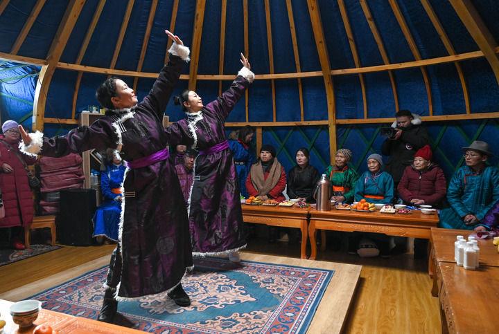 △2023年12月21日,乌兰牧骑队员在内蒙古阿其图乌拉苏木进行舞蹈表演。 “源于人民、为了人民、属于人民,是社会主义文艺的根本立场,也是社会主义文艺繁荣发展的动力所在。”习近平总书记强调,广大文艺工作者要坚持以人民为中心的创作导向,把人民放在心中最高位置。 以作家柳青“对陕西关中农民生活有深入了解,所以笔下的人物才那样栩栩如生”的生动事例,鞭策文艺工作者要从人民的伟大实践和丰富多彩的生活中汲取营养;给耄耋之年加入中国共产党的电影表演艺术家牛犇写信,勉励他“继续在从艺做人上作表率,带动更多文艺工作者做有信仰、有情怀、有担当的人”;鼓励乌兰牧骑队员永远做草原上的“红色文艺轻骑兵”;给中国戏曲学院师生回信,勉励他们“在教学相长中探寻艺术真谛,在服务人民中砥砺从艺初心”…… 情深意切的话语,饱含着习近平总书记对文艺工作者“扎根人民”的殷切期望。 ——立时代之潮头、发时代之先声 2021年6月28日晚,“鸟巢”上空,绚烂的焰火升腾绽放,化作“100”的纪年字样,掌声欢呼声响彻夜空……中国文艺用华美篇章,深情礼赞党的百年华诞。文艺演出《伟大征程》热忱诠释着文艺工作者与党同心、与民同心的坚定信念。