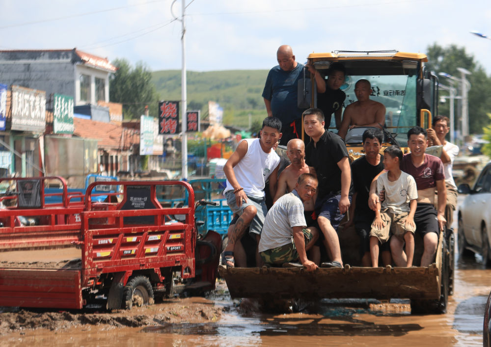 2024年8月21日,葫芦岛市建昌县部分受灾居民乘铲车转移。