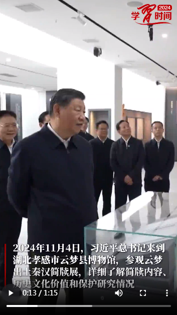 2024年11月4日,习近平总书记来到湖北孝感市云梦县博物馆,参观云梦出土秦汉简牍展,详细了解简牍内容、历史文化价值和保护研究情况。