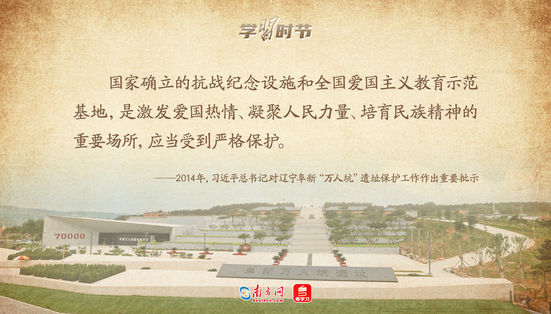 2014年9月,一份反映辽宁阜新“万人坑”遗址遭破坏的报告送到了习近平总书记的案头。习近平总书记对此写下大段批示,要求辽宁省委、省政府和国家文物局要以高度的政治责任感,迅速落实对阜新“万人坑”死难矿工纪念馆的维修改善工作,尽早恢复其爱国主义教育基地功能。“有类似阜新情况的,务必抓紧进行维修,切实做好保护、利用工作,充分发挥其在加强爱国主义教育、培育社会主义核心价值观中的重要作用。”