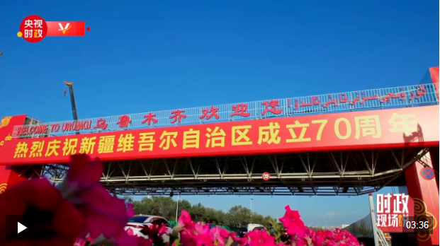 中共中央总书记、国家主席、中央军委主席习近平率中央代表团23日下午乘专机抵达乌鲁木齐,出席新疆维吾尔自治区成立70周年庆祝活动。14时20分许,习近平乘坐的专机在天山国际机场降落,等候在停机坪的新疆各族各界群众热烈欢呼。习近平走下舷梯时,少先队员献上鲜花。各族群众代表身着民族服饰,载歌载舞,欢迎总书记的到来,表达对总书记的衷心祝福。