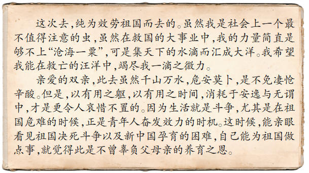 “我之所以不别而行,这是女儿勇气不够的缘故,因为骨肉之情,总是难免的。”信的开篇便展现了白雪娇内心的撕扯——不舍、矛盾、决绝……她既有传统孝道观念中对父母的愧疚,又有新时代青年对民族命运的担当。这种矛盾在“在每分钟内,我的心起着往复数次的矛盾冲突”的表达中达到顶点——一边是所恋的家和所爱的双亲弟妹,一边是破碎的祖国。她深爱着她的家,并将选择建立在牺牲这份小我的温馨之上,这使得她的选择更显悲壮和决绝。