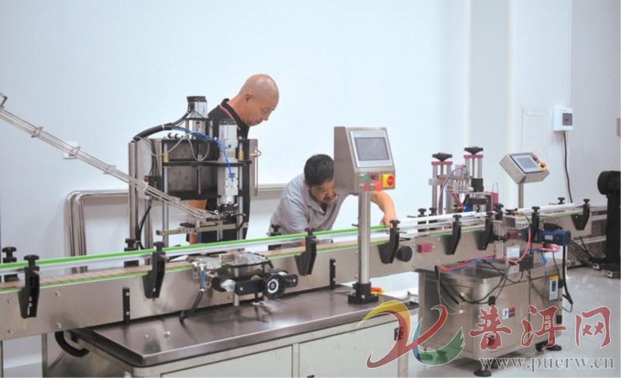 △普洱乌金咖啡有限责任公司工作人员正在调试咖啡全自动灌装机。(思茅区融媒体中心提供)