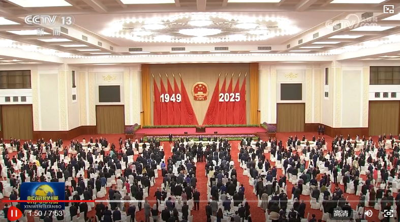 人民大会堂宴会厅华灯璀璨,洋溢着喜庆热烈的节日氛围。主席台上方高悬着庄严的国徽,“1949-2025”大字年号在鲜艳红旗映衬下格外醒目。