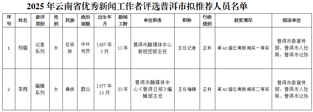附件2:2025年云南省优秀新闻工作者普洱市拟推荐人员名单