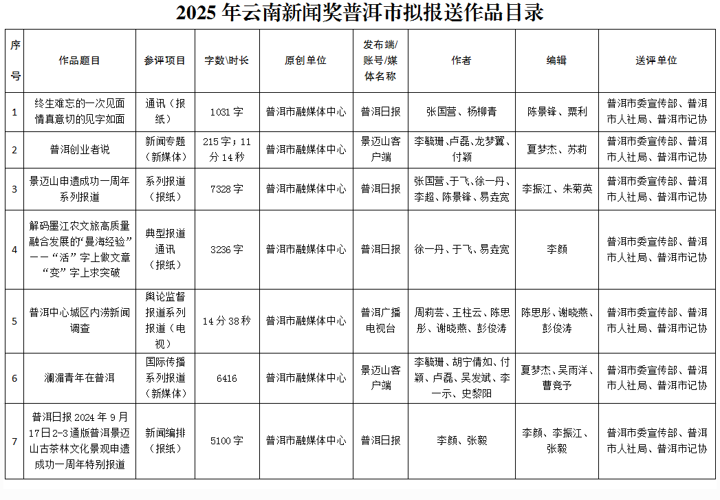 附件1:2025年云南新闻奖评选普洱市拟报送作品目录