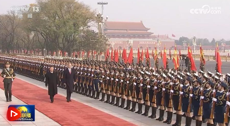 费利佩六世抵达时,礼兵列队致敬。习近平同费利佩六世登上检阅台,军乐团奏中西两国国歌,天安门广场鸣放礼炮21响。费利佩六世在习近平陪同下检阅中国人民解放军仪仗队,并观看分列式。