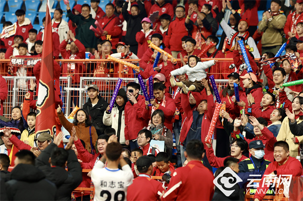 滇超联赛,是一场覆盖全省、全民关注、全域联动的足球盛会。开赛仪式上,在2.3万名现场观众的欢呼声浪中,伴随着滇超联赛推广曲《燃动风云》的旋律,16个州市代表队逐一入场,以“运动员+特色表演队”形式行进式表演,各具特色的舞蹈体现着云南民族文化的多姿多彩,现场观众挥舞着旗帜与荧光棒为他们呐喊,整个高原体育运动中心变成狂欢的现场。