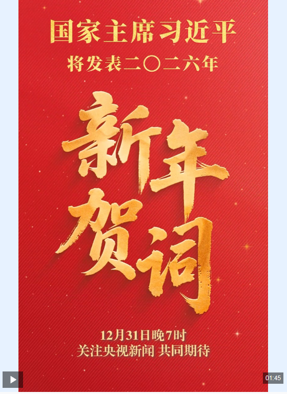 31日晚7时,国家主席习近平将通过中央广播电视总台和互联网,发表二〇二六年新年贺词。