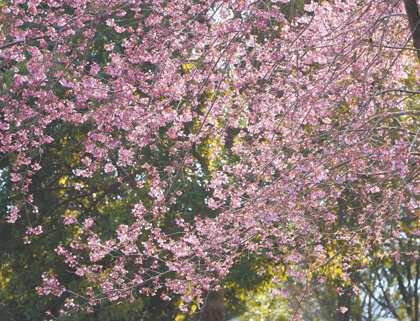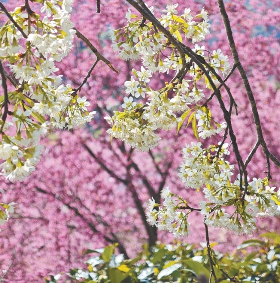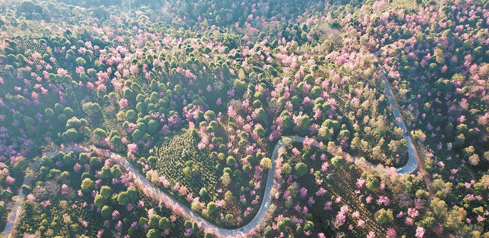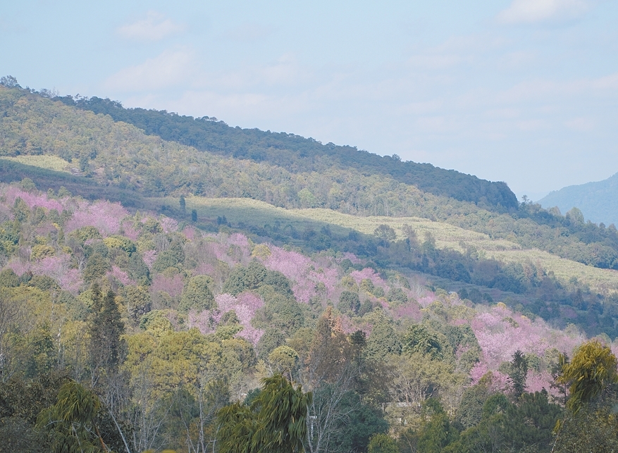 一片片枝叶的浅吟,融汇成大自然的交响曲,这是冬樱花的组曲。从县城茶试站那一方精巧的庭景景致开始,花影尚带着几分人间烟火气;步入大街樱花谷,便踏入了被繁花彻底笼罩的漫长小径,天空化作流动的粉白色诗行;而最终抵达哀牢山深处——樱花在这里重归野性,在云雾与原始密林间,开得恣意而磅礴。