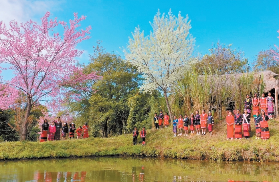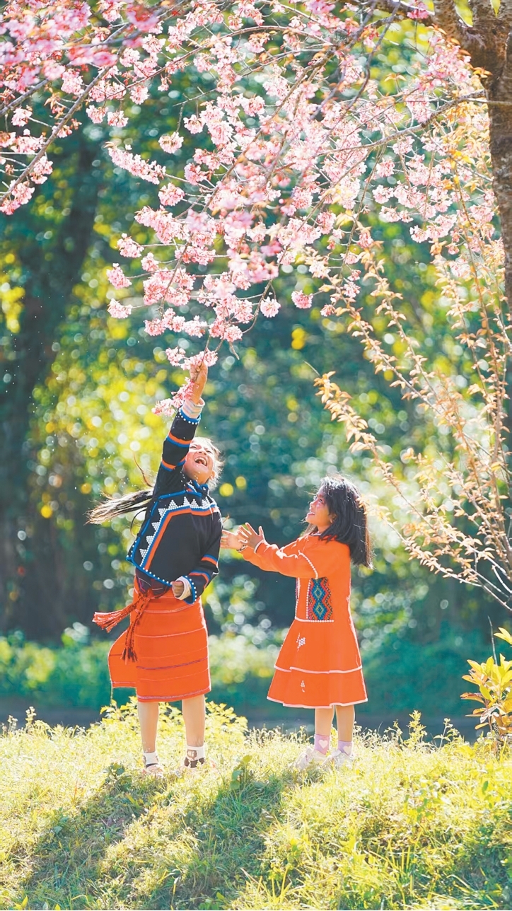 村寨的湖水倒映着疏落的花枝,山岚升起时,花与树便化作氤氲的淡影,似水墨在纸上轻轻化开。这里的樱花从不喧哗,也不成片招摇,却总在你经过某个村口、某个山坡时,以一树静默的绯红,赠你一份不期而遇的欢喜。
