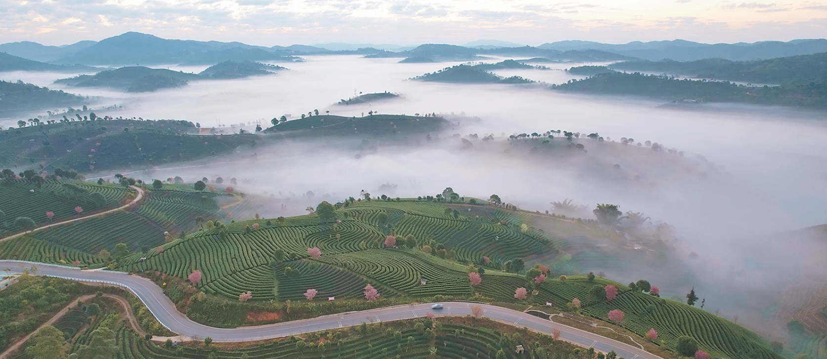 在景迈山,你会遇见一场天地之间的温柔对话——云海在脚下翻涌,千年古茶林与初绽的冬樱静静相依。风起,花瓣轻坠,飘向乳白的云端,分不清是落回了人间,还是化作了天空的绯色诗行。