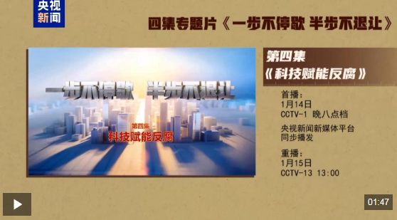 电视专题片《一步不停歇 半步不退让》第四集《科技赋能反腐》,讲述纪检监察机关丰富防治新型腐败和隐性腐败有效办法,以信息化赋能正风反腐,充分运用科技手段精准发现不正之风和腐败问题线索、迅速有效突破案件,着力提升智慧反腐、科技反腐水平。总台央视综合频道1月14日晚8点档播出,央视新闻新媒体平台同步播发。