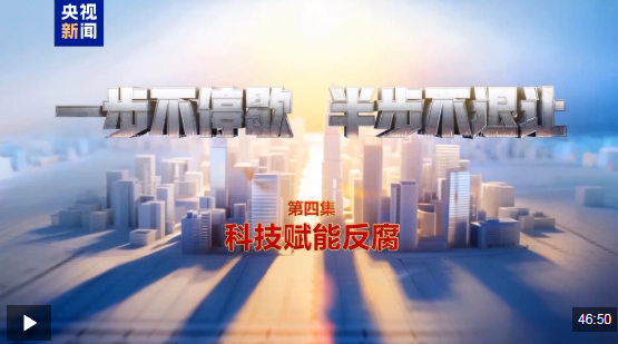 由中央纪委国家监委宣传部与中央广播电视总台央视联合摄制的电视专题片《一步不停歇 半步不退让》,1月14日在总台央视综合频道晚8点档播出第四集《科技赋能反腐》,央视新闻新媒体平台同步播发。