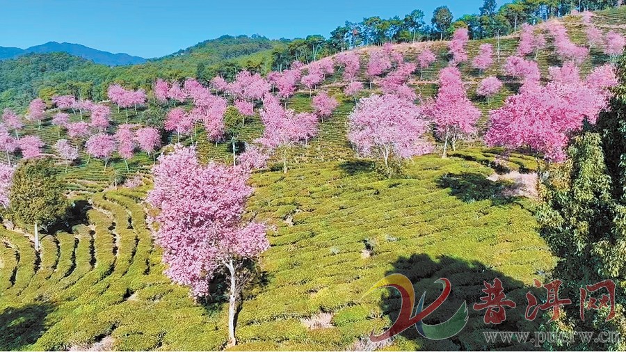 每年的十二月至次年一月,普洱的冬樱花便会如期苏醒,将粉红相间的绚烂色彩泼洒在山野之间,远望,花树如云霞缭绕于青绿色的峰林间;近观,鲜艳的花朵和翠绿的茶山、村落相映成趣,构成了一幅灵动的山水画卷。这绝美的风景不仅为普洱暖冬带来无限浪漫,也吸引了人群纷至踏来,带来了“美丽经济”。