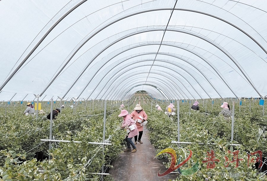 在墨江县新安镇蓝莓种植基地,智能大棚内暖意融融,整齐排列的种植架上,饱满的蓝莓泛着深紫色光泽。工人们穿梭其间忙着采摘,一派产业兴旺、农户增收的繁忙景象。“基地总采用水肥一体化智能灌溉系统,采摘可持续至5月,每轮可采收600—700公斤,年产量预计90吨,主要销往北上广等一线城市。”基地负责人段军飞介绍。