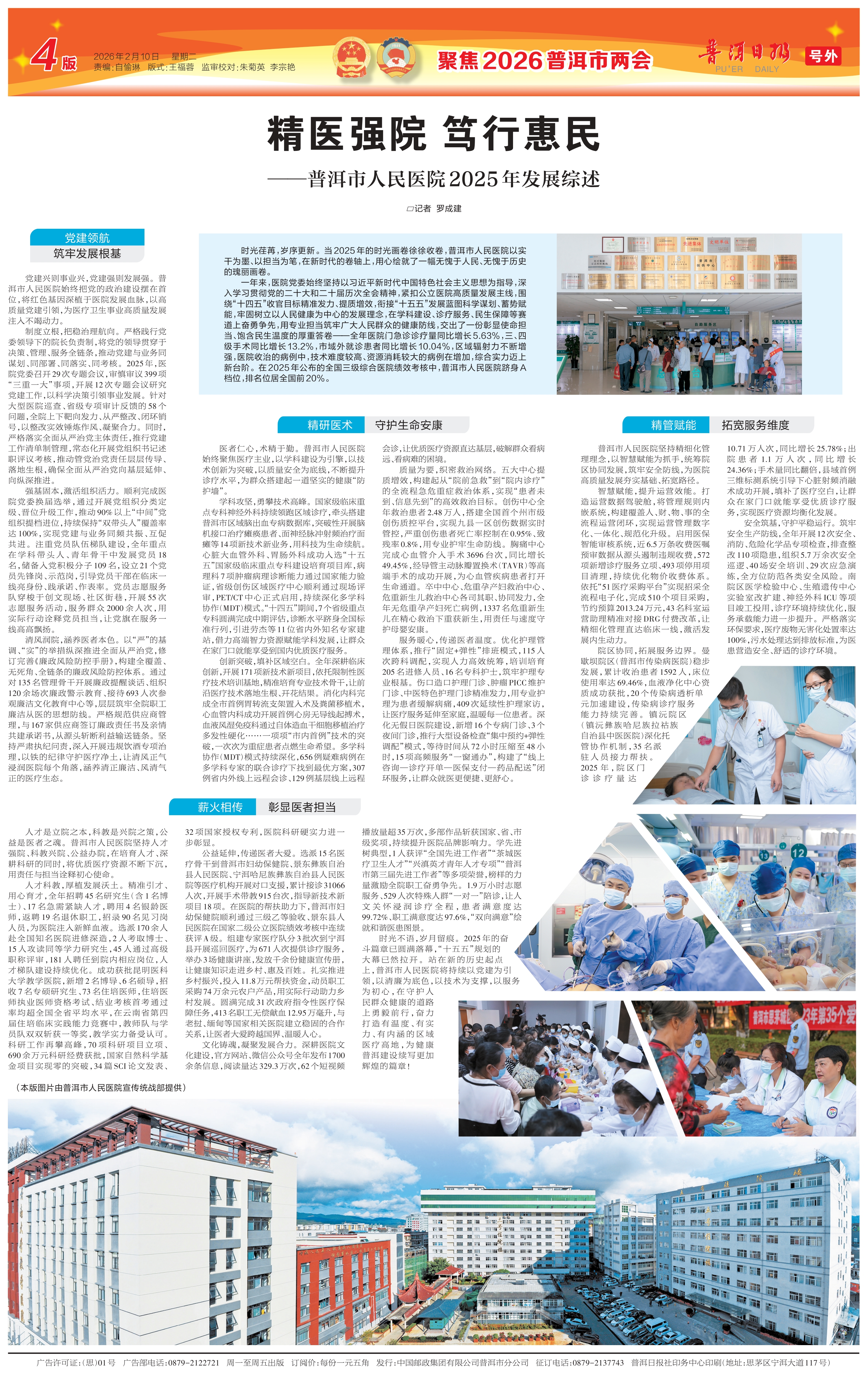 时光不语,岁月留痕。2025年的奋斗篇章已圆满落幕,“十五五”规划的大幕已然拉开。站在新的历史起点上,普洱市人民医院将持续以党建为引领,以清廉为底色,以技术为支撑,以服务为初心,在守护人民群众健康的道路上勇毅前行,奋力打造有温度、有实力、有内涵的区域医疗高地,为健康普洱建设续写更加辉煌的篇章!(本版图片由普洱市人民医院宣传统战部提供)