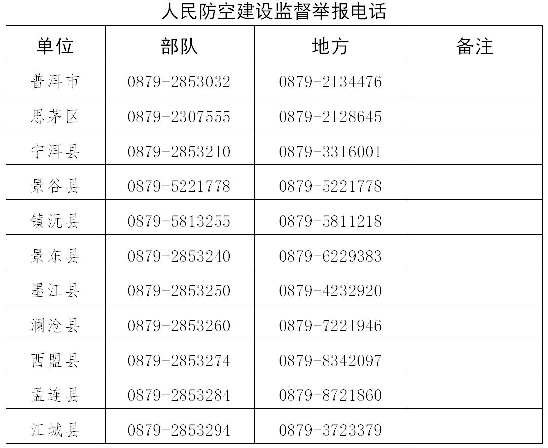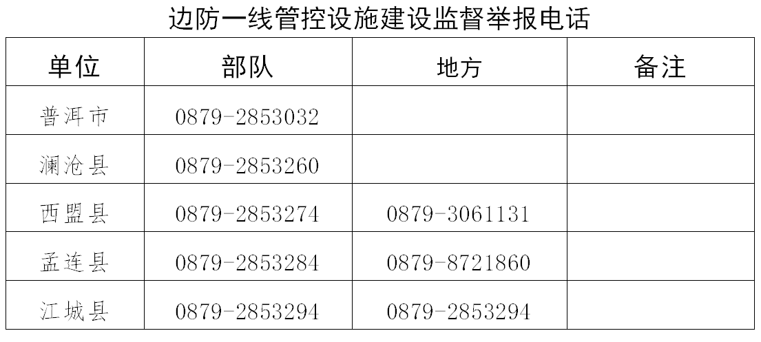 根据军队国防动员系统专项整肃治理行业整治相关规定要求,为提高整肃治理质效,推动行业风气根本好转,现将普洱市边防一线管控设施建设和人民防空建设专项整肃治理监督举报电话公示如下: