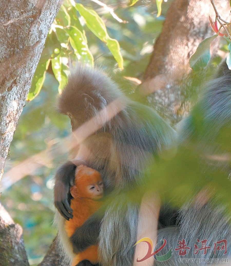 保护区的密林深处,几群全身灰色、拖着长尾巴的印支灰叶猴在树梢间灵活跳跃,时而采食嫩叶,时而闭目休憩。不远处,一只浑身金黄的猴宝宝正依偎在母亲怀中。母猴轻轻护住幼崽,猴宝宝则不时探出脑袋好奇张望。据景东县公安局环食药侦大队民警商航源介绍,这只猴宝宝已经出生一个多月。印支灰叶猴幼崽出生时通体金黄,三个月后体色逐渐变为灰色。