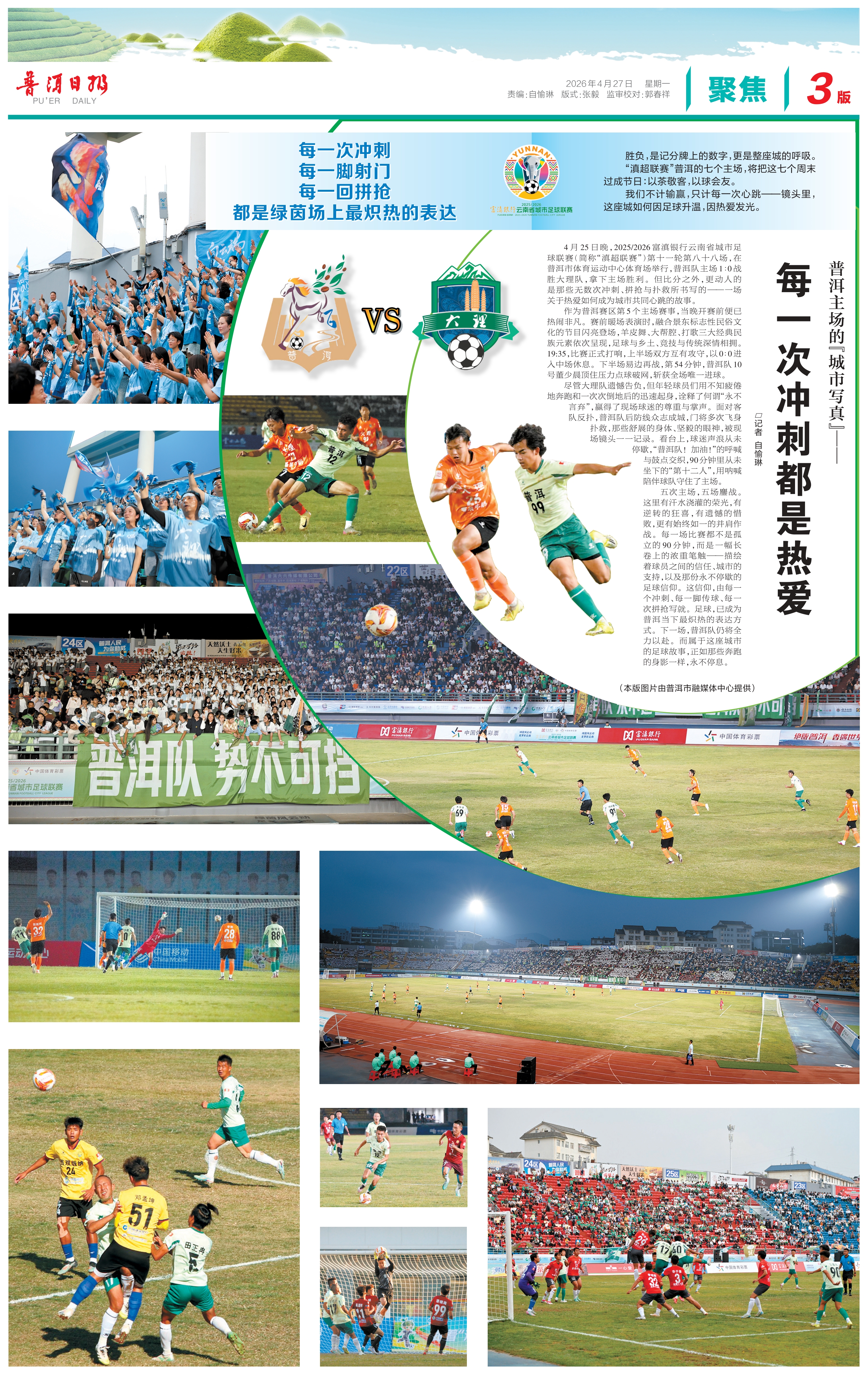 五次主场,五场鏖战。这里有汗水浇灌的荣光,有逆转的狂喜,有遗憾的惜败,更有始终如一的并肩作战。每一场比赛都不是孤立的90分钟,而是一幅长卷上的浓重笔触——描绘着球员之间的信任、城市的支持,以及那份永不停歇的足球信仰。这信仰,由每一个冲刺、每一脚传球、每一次拼抢写就。足球,已成为普洱当下最炽热的表达方式。下一场,普洱队仍将全力以赴。而属于这座城市的足球故事,正如那些奔跑的身影一样,永不停息。(本版图片由普洱市融媒体中心提供)