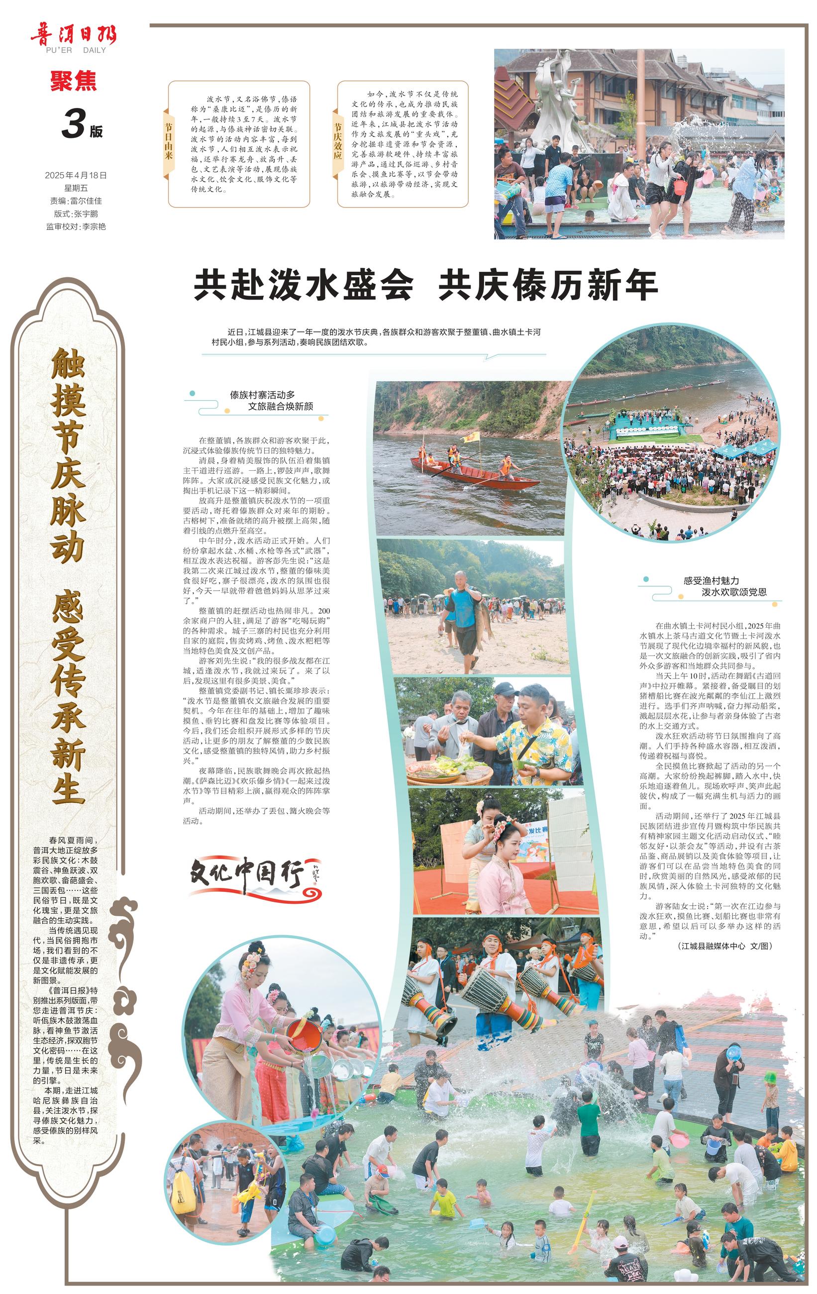 泼水节,又名浴佛节,傣语称为“桑康比迈”,是傣历的新年,一般持续3至7天。泼水节的起源,与傣族神话密切关联。泼水节的活动内容丰富,每到泼水节,人们相互泼水表示祝福,还举行赛龙舟、放高升、丢包、文艺表演等活动,展现傣族水文化、饮食文化、服饰文化等传统文化。