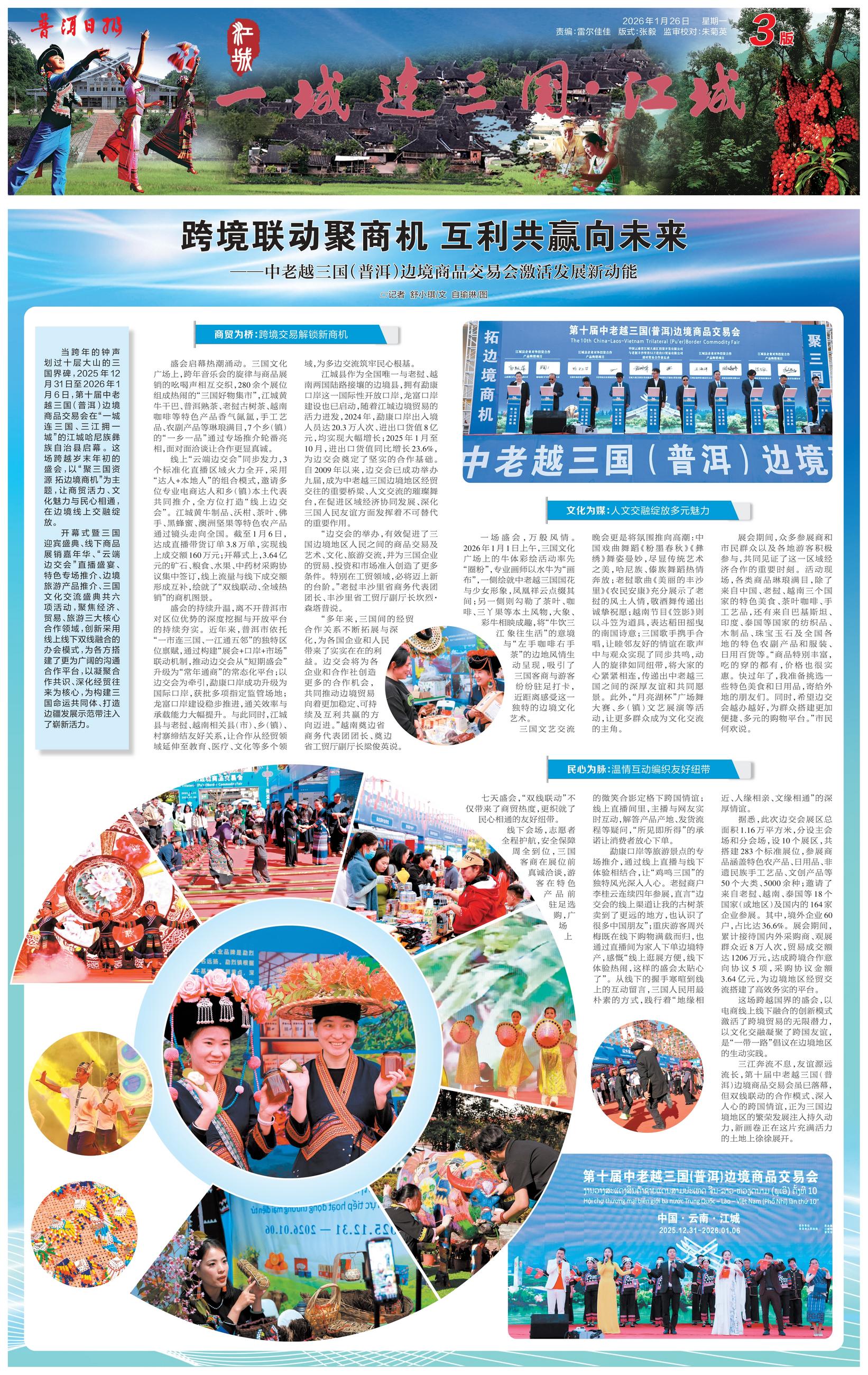 当跨年的钟声划过十层大山的三国界碑,2025年12月31日至2026年1月6日,第十届中老越三国(普洱)边境商品交易会在“一城连三国、三江拥一城”的江城哈尼族彝族自治县启幕。这场跨越岁末年初的盛会,以“聚三国资源 拓边境商机”为主题,让商贸活力、文化魅力与民心相通,在边境线上交融绽放。