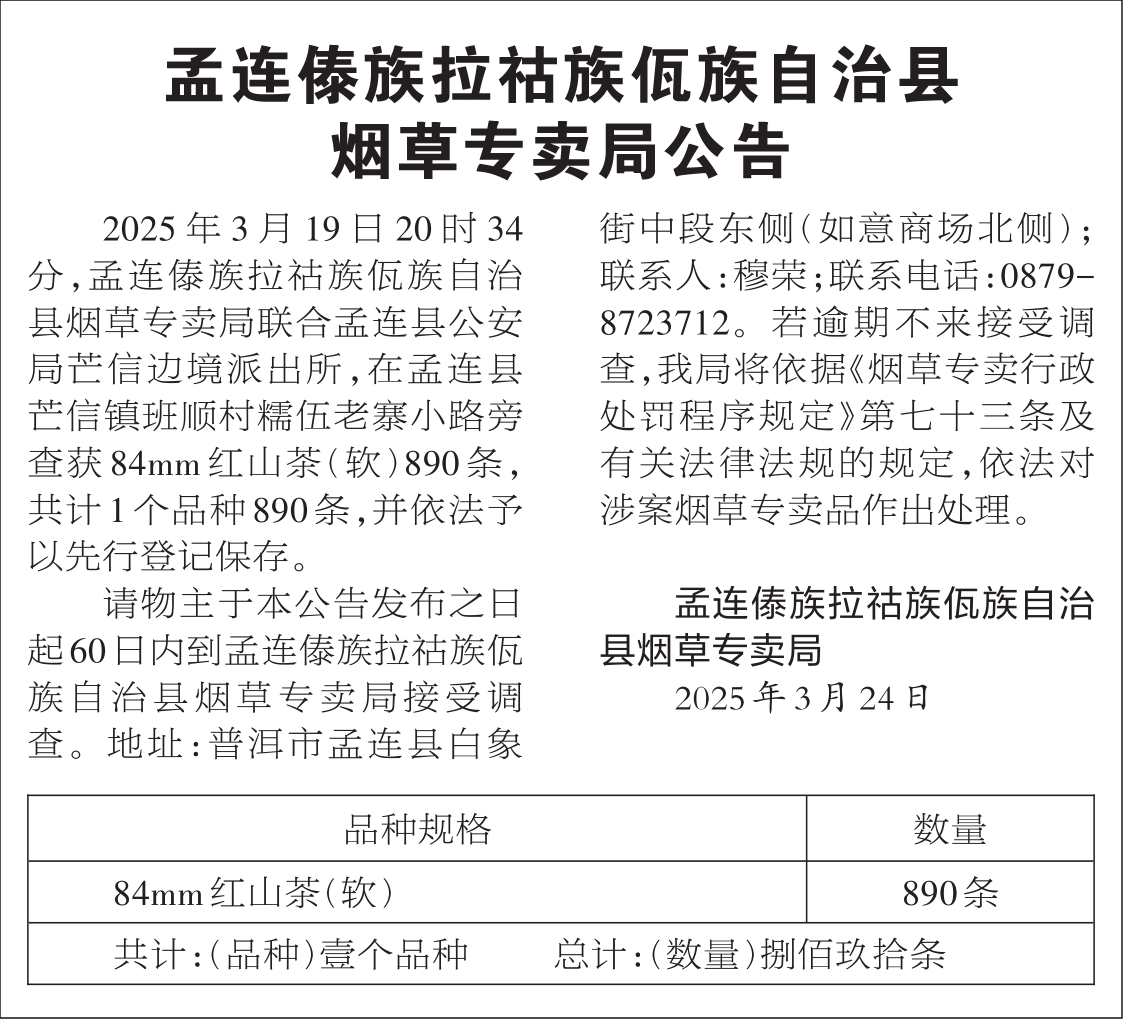 孟连傣族拉祜族佤族自治县烟草专卖局公告