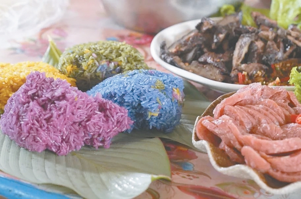 把新鲜采摘或晒干的紫兰草、染饭花、蓝雀花、娘惹花进行熬煮,用其浸泡糯米4小时以上,再用蒸笼蒸熟。揭开锅盖,扑鼻而来的糯米香掺着植物特有的清香,黄的、紫的、蓝的、绿的,米粒软糯、粒粒分明、色泽鲜艳,再配上烤鱼、烤肉、腌肉,不同的口感在舌尖绽放,色、香、味皆可兼得。