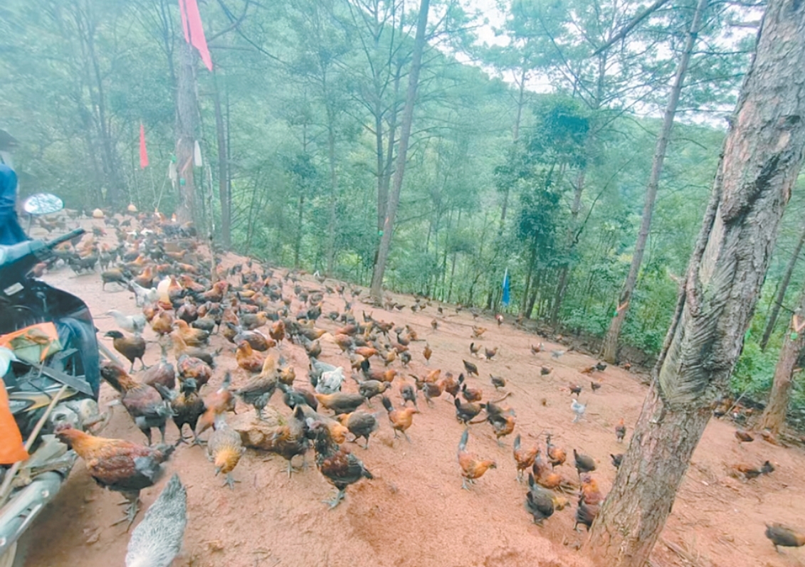 本报讯(通讯员 张其琴 文/图) 清晨,景谷傣族彝族自治县半坡乡曼伞村还笼罩在薄雾中,响亮的鸡鸣声此起彼伏,打破了山野的宁静。放眼望去,成群毛色鲜亮、体态健硕的土鸡在林下悠然踱步、刨食嬉戏,呈现出一幅生机勃勃的生态养殖画卷。