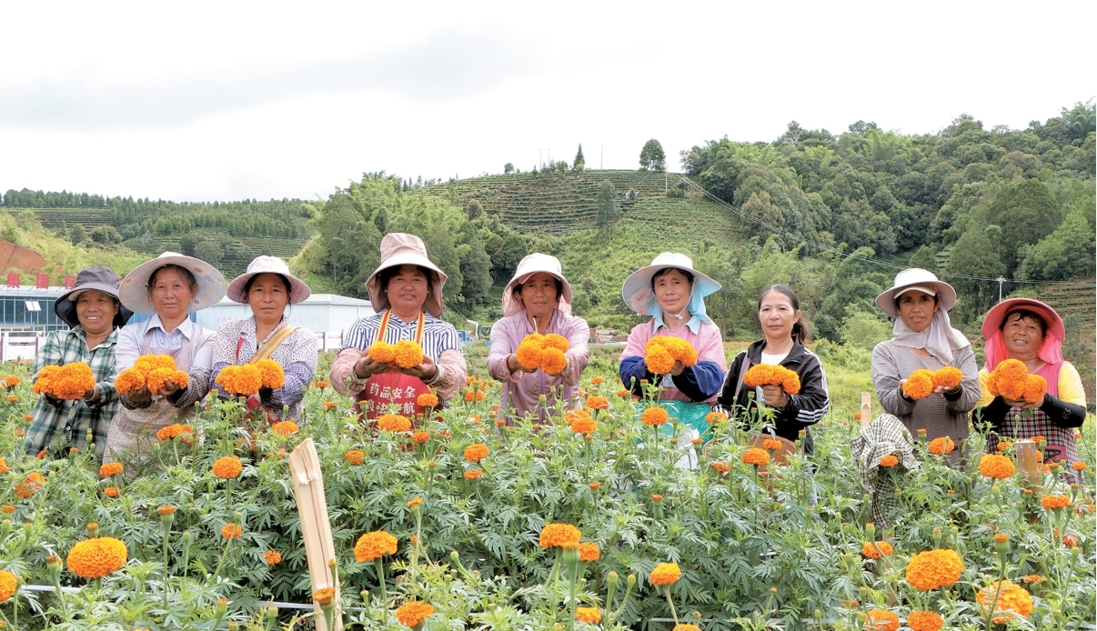 与此同时,联珠镇高寨村、癸能村等地的万寿菊种植基地里,同样迎来丰收盛景。连片的金色花田间,村民们俯身采摘、小心装篓,动作娴熟而有序。基地在延续传统种植优势的基础上,通过精细化管理持续提升万寿菊的品质与亩产效益,让传统种植模式焕发新活力。