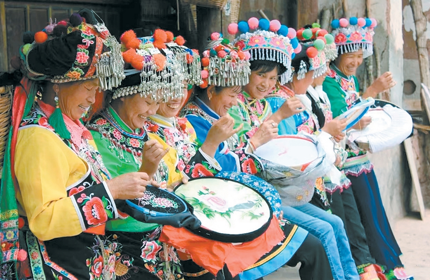 “唱起来呀绣起来呀,绣出如今好日子……”在被评为“云南十大刺绣名村”的景东县安定镇青云村,省级非物质文化遗产项目代表性传承人李海仙正带着村里的绣娘学习刺绣。她们身着彝族服饰,唱着彝族小调,手拈绣花针,手指上下翻飞间,底色各异的绣花箍上随即出现花鸟鱼虫等一个个特色鲜明的图案。