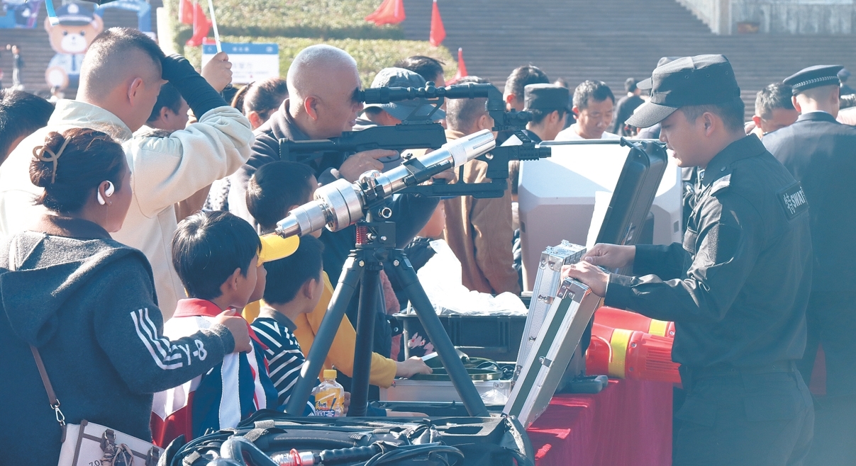 反诈宣传环节寓教于乐,市公安局反诈中心联合多家银行、通信运营商及企业代表,通过有奖问答等方式,向群众普及防骗知识,切实提高公众识诈防诈的能力。警用装备展示区集中展示了“剑齿虎”特警突击车、森林消防救援车、警用摩托车、最小作战单元快反装备包、穿墙雷达、机器狗等先进装备,直观呈现了科技赋能现代警务的成果。