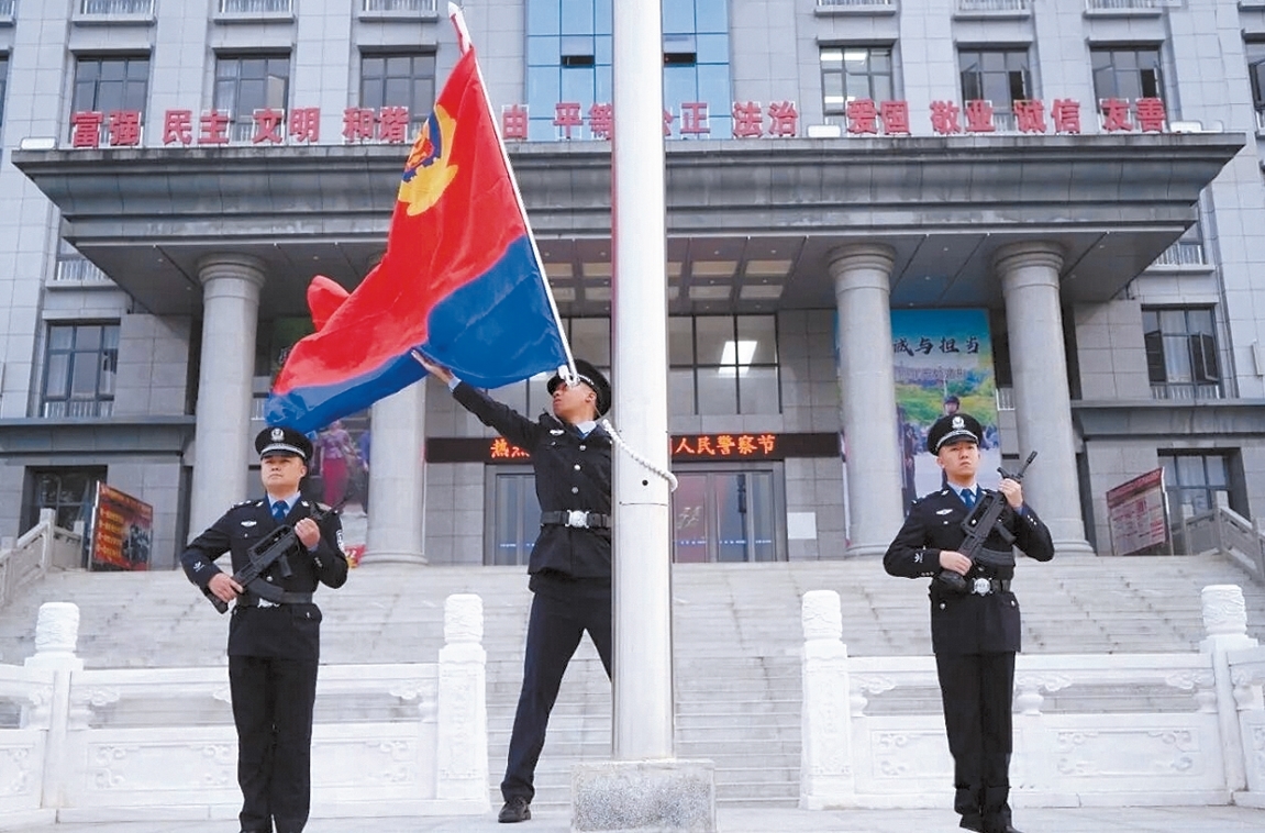 当天上午,护旗手迈着铿锵步伐护卫警旗入场,伴随着《中国人民警察警歌》,红蓝警旗迎着朝阳冉冉升起。全体民警、辅警肃立注目、庄严敬礼,表达对公安事业的忠诚与热爱。