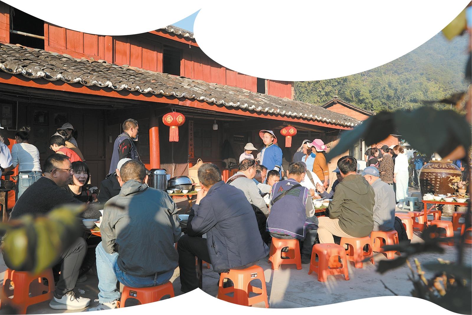 酒过三巡,菜过五味,席间欢声笑语,主人家不停地给客人添菜倒酒,一句“多吃点”,朴实又真诚,邻里们围坐闲谈,说着一年的收成与古道的往事,言语间都是满足与惬意。