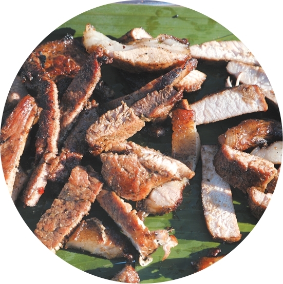 新鲜的猪肉被麻利地切成厚片,拌上盐巴辣椒和自家磨的香料,抓匀腌制入味。