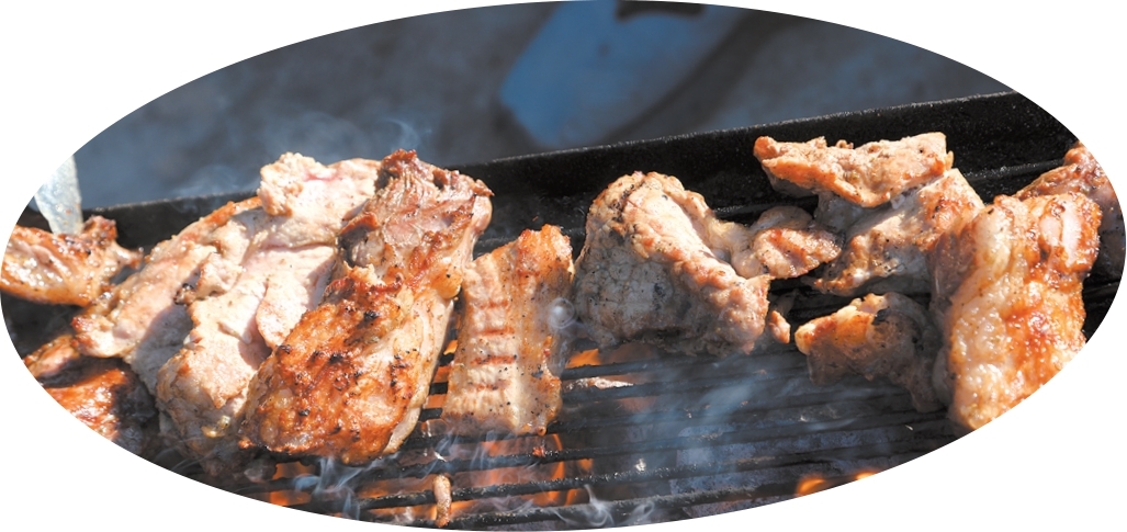 院子里架起炭火烤架,五花肉、猪皮、糯米粑粑、包浆豆腐等依次摆上。